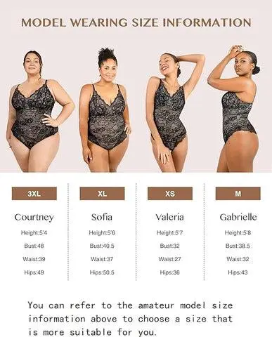 Lace bodysuit with little stretchy only, if you are over C cup, then choose one or two size up.