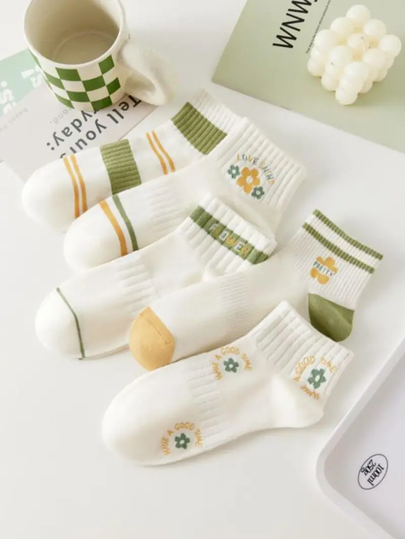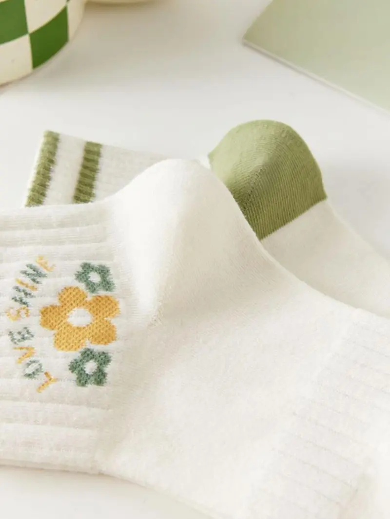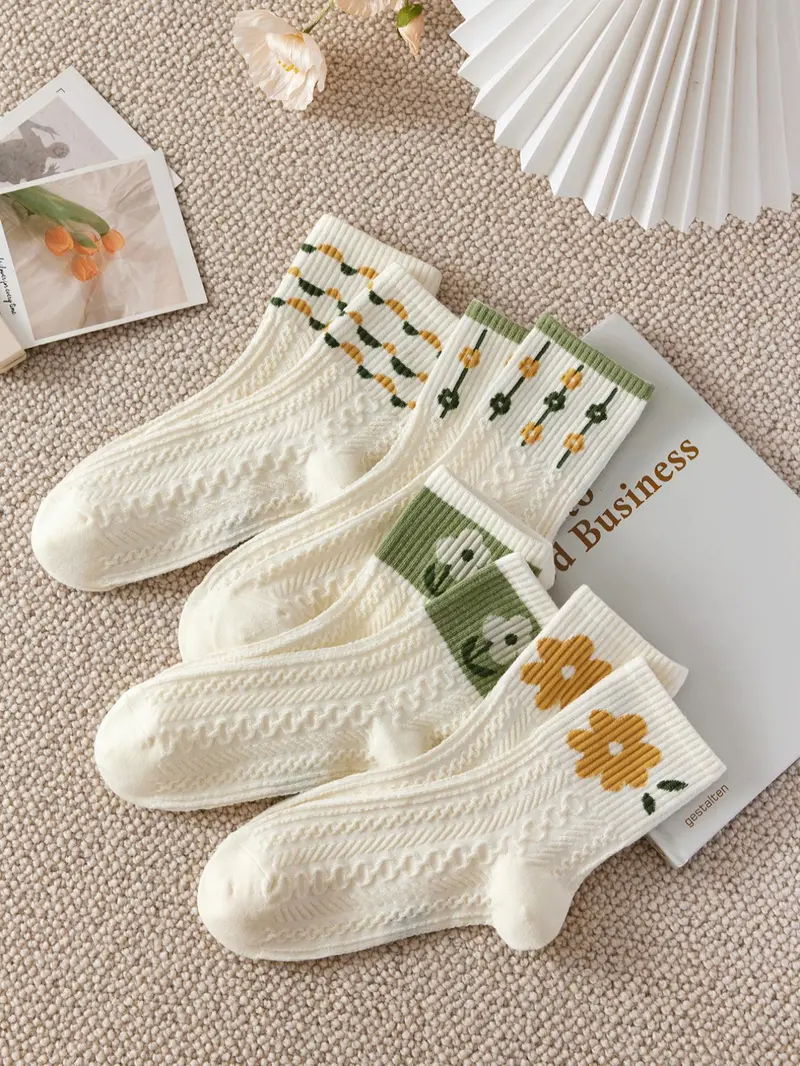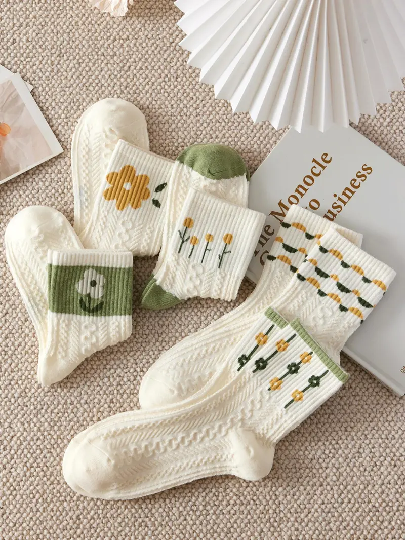 Women'S 5 Pairs Floral Print Textured Crew Socks, Fashion Casual Cozy Socks for