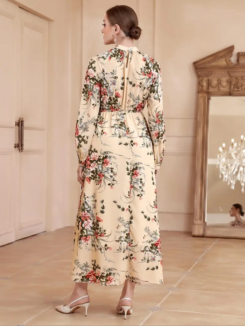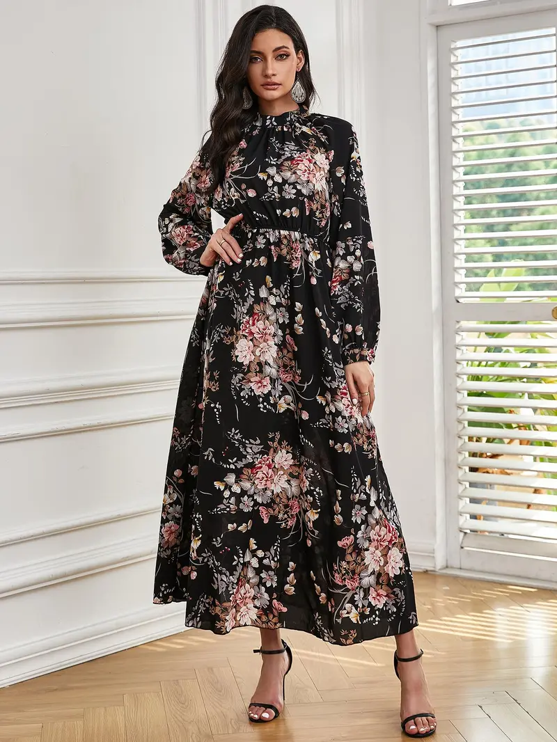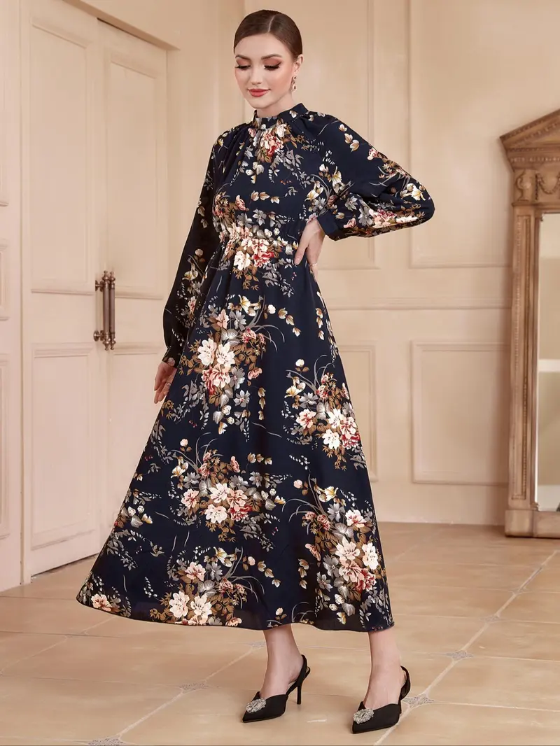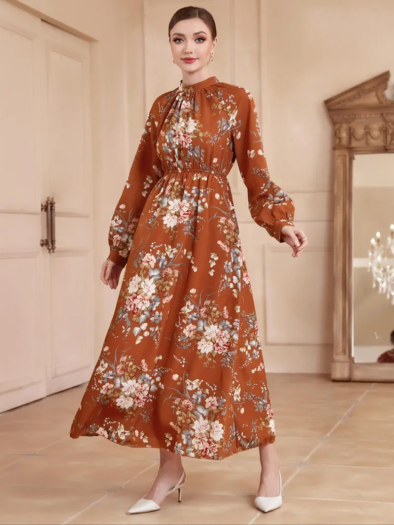 Women'S Floral Print Bishop Sleeve Mock Neck A-Line Long Dress, Boho Casual Chif
