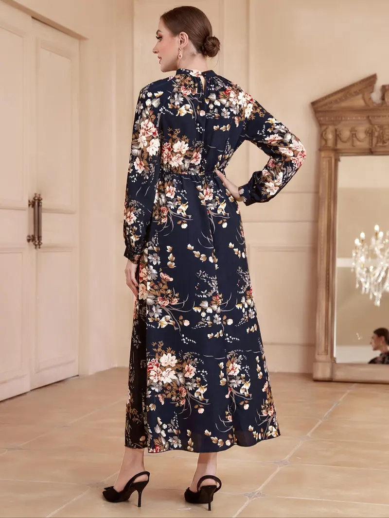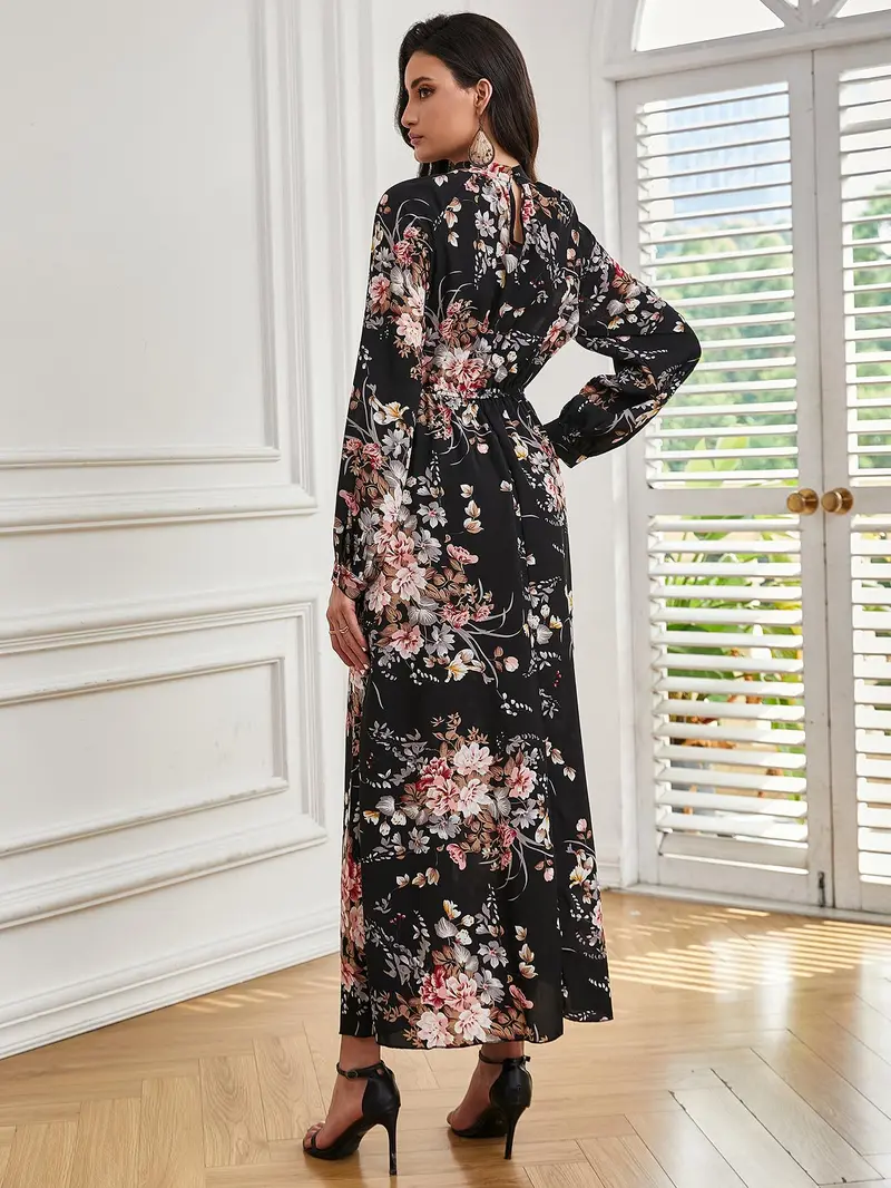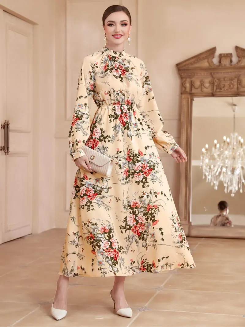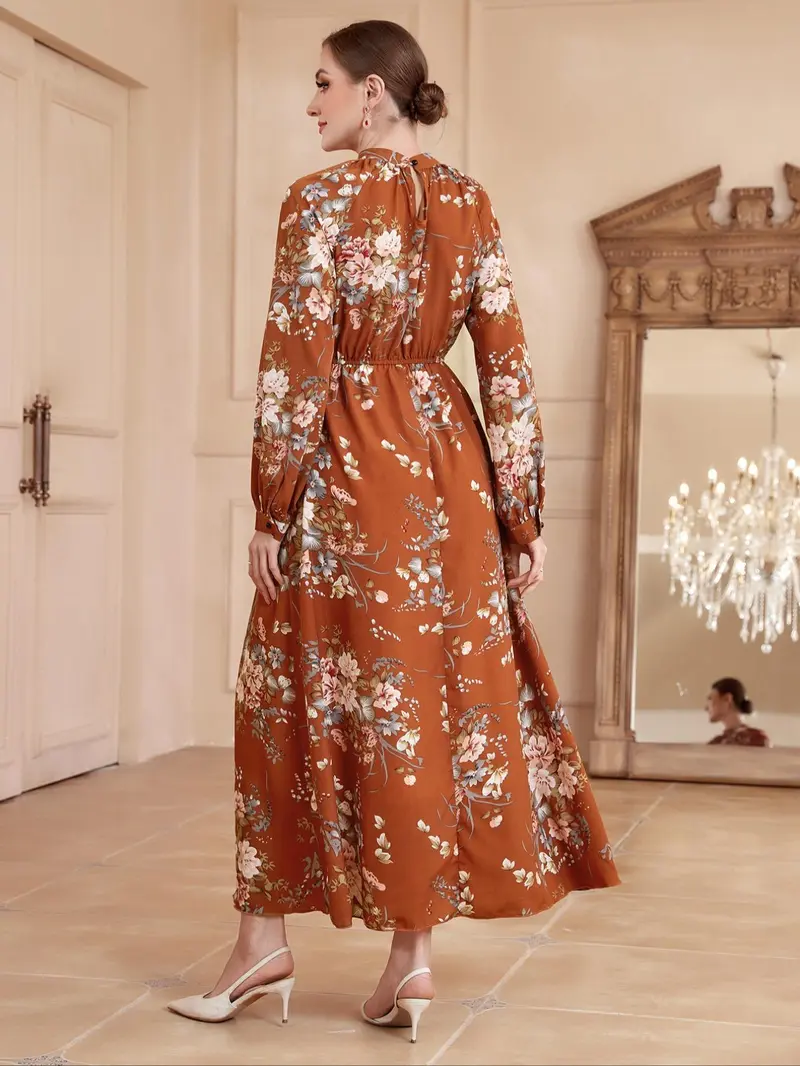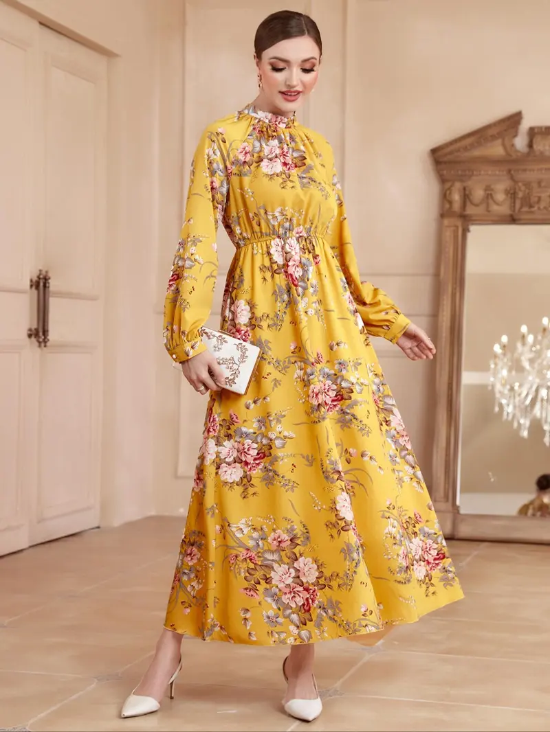 Women'S Floral Print Bishop Sleeve Mock Neck A-Line Long Dress, Boho Casual Chif