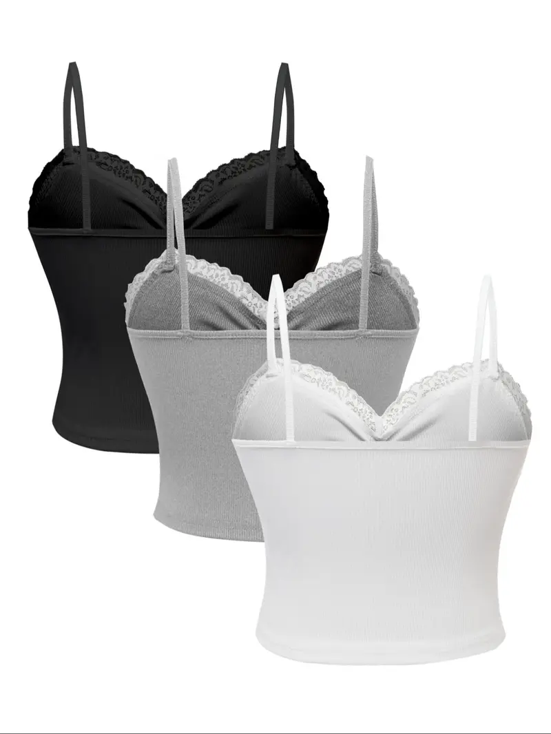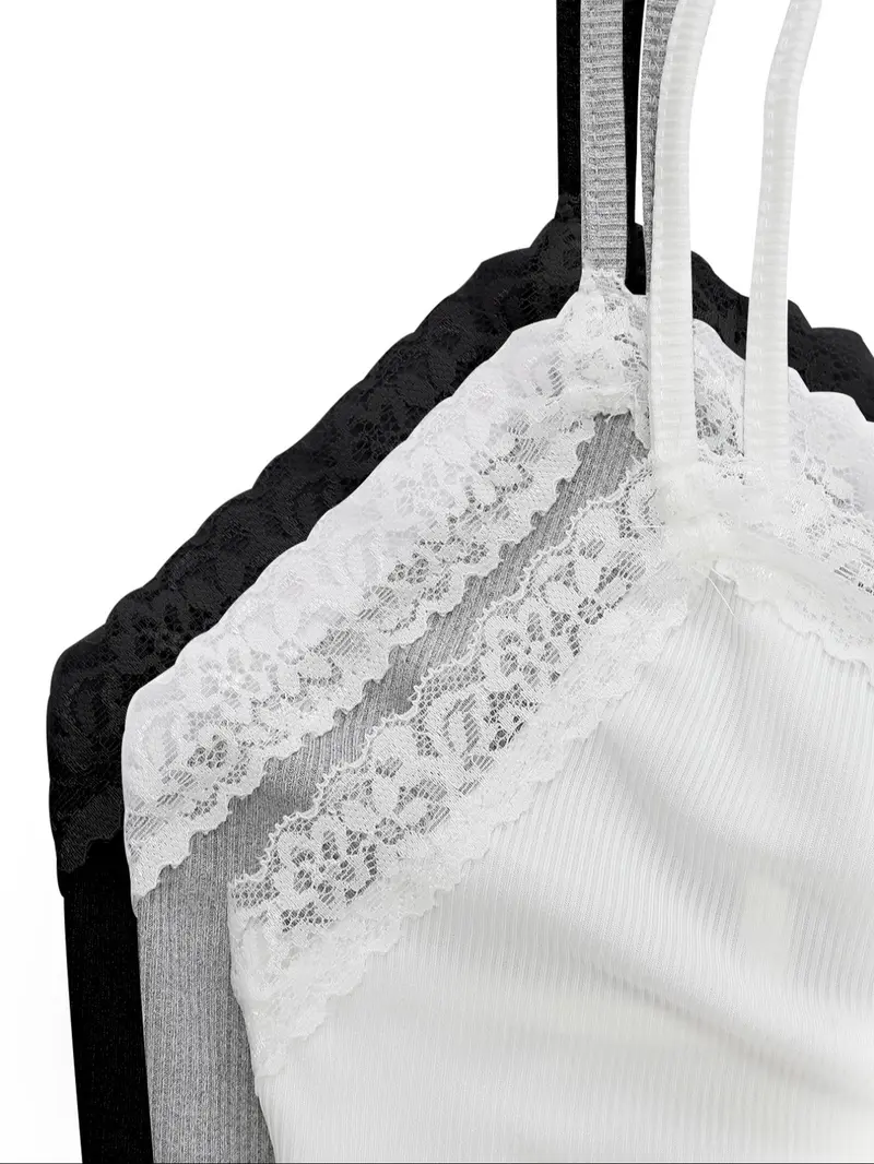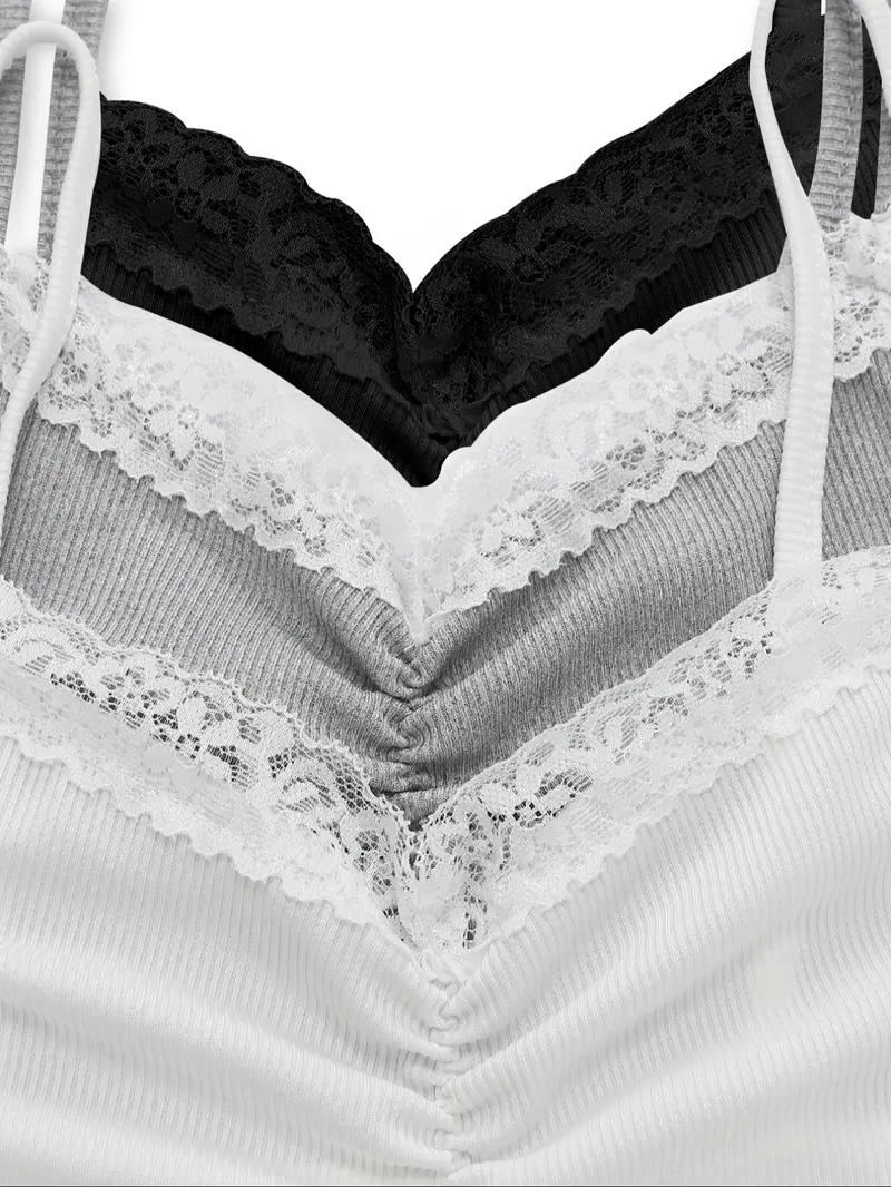 - 【Chic Contrast Lace & Ruched Design】: Elevate your wardrobe with the solid spaghetti strap top, featuring exquisite contrast lace and ruched detailing for a touch of sophistication and style.
