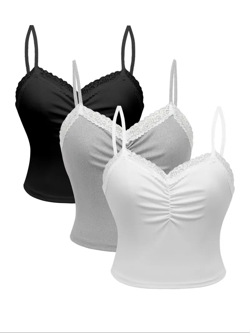 Women'S Minimalist Contrast Lace Ruched Sleeveless Crop Cami Top, Tank Tops for